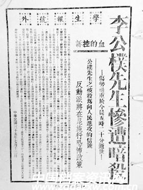 关于李公朴先生遇刺的经过,在云南省档案馆所藏 “ 云南高等法院全宗 ” 档案中一份当年的《学生报》号外是这样报道的:(本报讯)民主战士李公朴先生于昨日晚九时五十分,与其夫人张曼筠女士于返家途中,乘公共汽车下站后,在青云街转大兴街岔路上,被持有手枪的之特务分子暗杀,子弹从右后腰射入,自左前腹穿出,血流如注,伤势严重。饮弹倒地后,经附近市民及路过同学施救,立即送往云大医院治疗。经医师检查,肠子被击穿三处。不幸已于今晨五时二十分逝世。临死时,神志清醒,曾言: “ 此种手段太卑鄙了! …… 我已经准备好了 …… 为民主而死 ……”