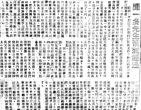 1946 年 7 月《群众周刊》第十一卷第十二期曾载有昆明李公朴闻一多血案后援会所记 “ 闻一多先生被刺经过 ” :