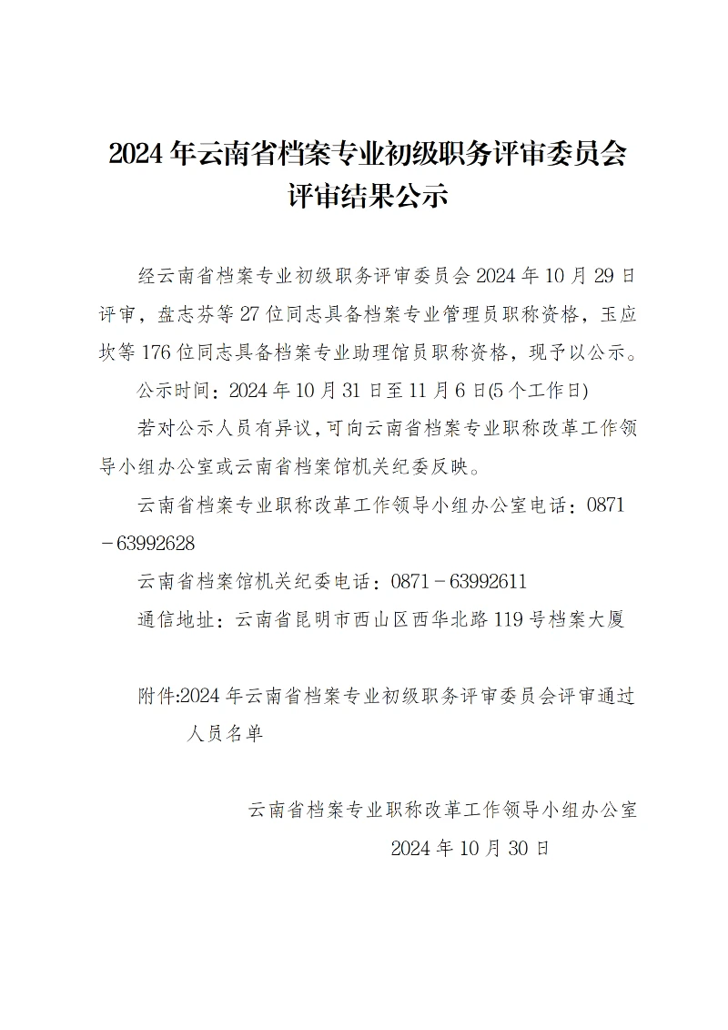 2024年云南省档案专业初级职务评审委员会评审结果公示