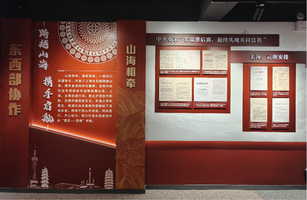 展览分为“跨越山海 携手启航”、“同心筑梦 彝山蝶变”、“山海情深 榜样力量”、“幸福花开 续写华章”以及“中央单位定点帮扶”5个部分,包含22个章节、88个板块,共展出342件珍贵档案,采用政策文件、实物档案展示和影像资料、数字化场景运用等多元手段,多维度展现了上海市嘉定区、杨浦区与楚雄州跨区域帮扶协作、中央单位与楚雄州贫困地区结对帮扶跨越40余载的感人故事和实践经验。