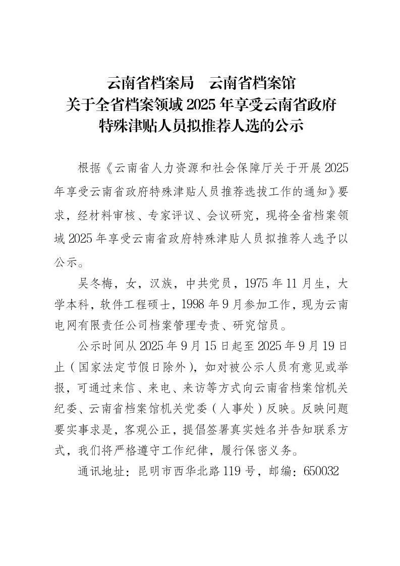 云南省档案局 云南省档案馆关于全省档案领域2025年享受云南省政府特殊津贴人员拟推荐人选的公示
