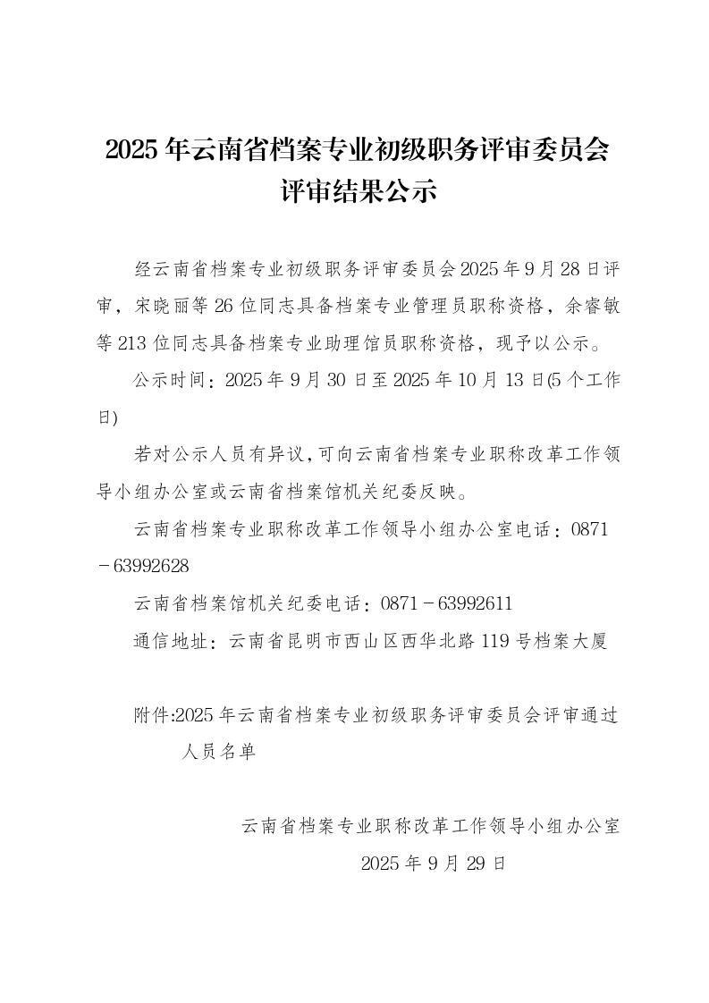 2025年云南省档案专业初级职务评审委员会评审结果公示