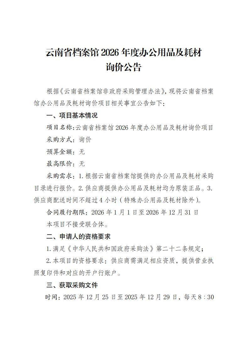 云南省档案馆2026年度办公用品及耗材询价公告