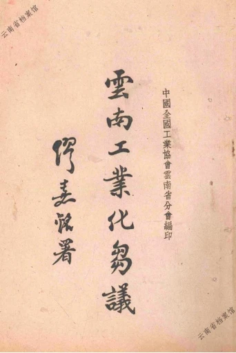 《云南工业化刍议》(以下简称《刍议》)是1946年缪云台所著,中国全国工业协会云南省分会编印,对云南近代的经济环境、资源、工业化步骤、工业化重要性及如何实现作了精炼的概括,短短的几页让人一目了然,他主张发展交通、电力、工业及民营企业来推动云南工业化发展。