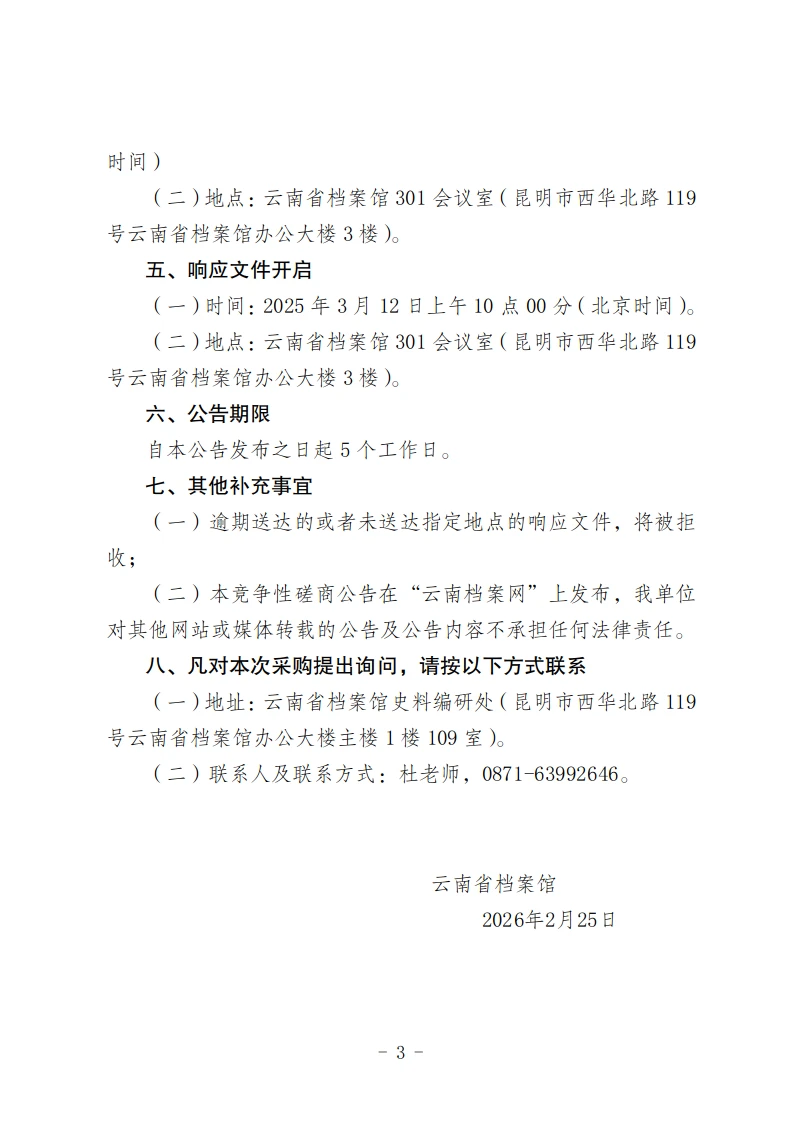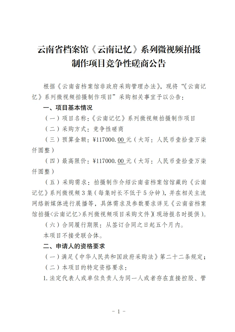 云南省档案馆《云南记忆》系列微视频拍摄制作项目竞争性磋商公告