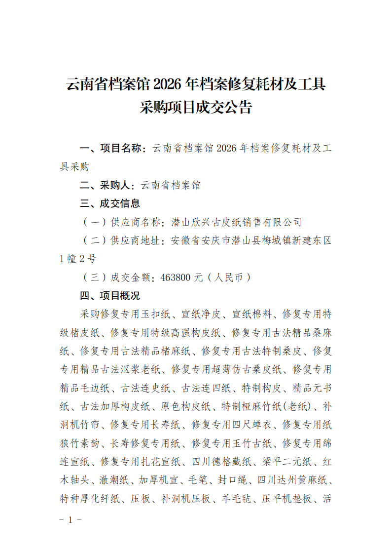 云南省档案馆2026年档案修复耗材及工具采购项目成交公告