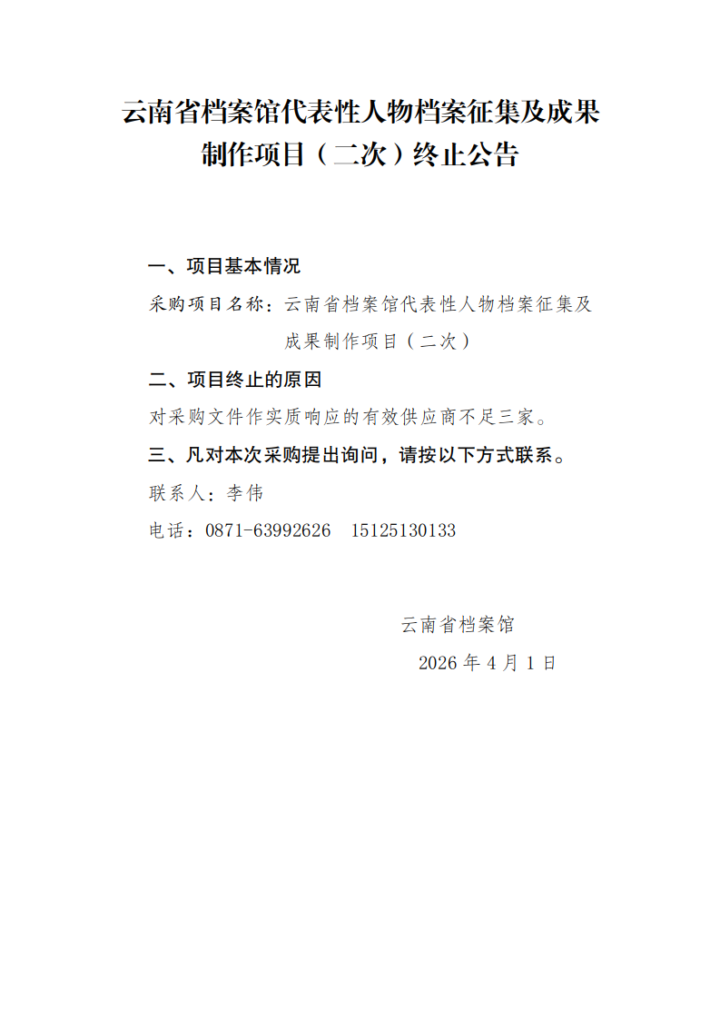 云南省档案馆代表性人物档案征集及成果制作项目(二次)终止公告